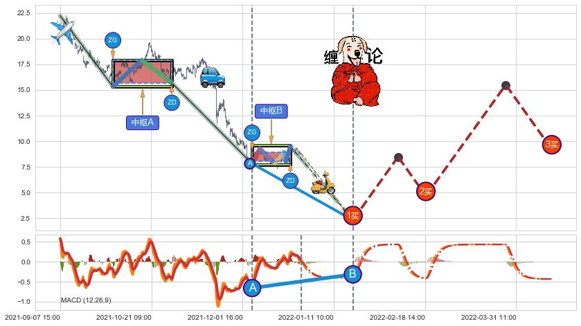 | 15 🅚:下跌两颗星 | 下跌三颗星 ➕ ☯️:缠论中枢点下降缠中枢B破位后距离1买距离较远,随后猜想后续持续下跌(趋势跟踪) ☞ 看空信号 ⇥ 【🅚线】交织【图形】⇥ 综合量化分数: 45 | > |