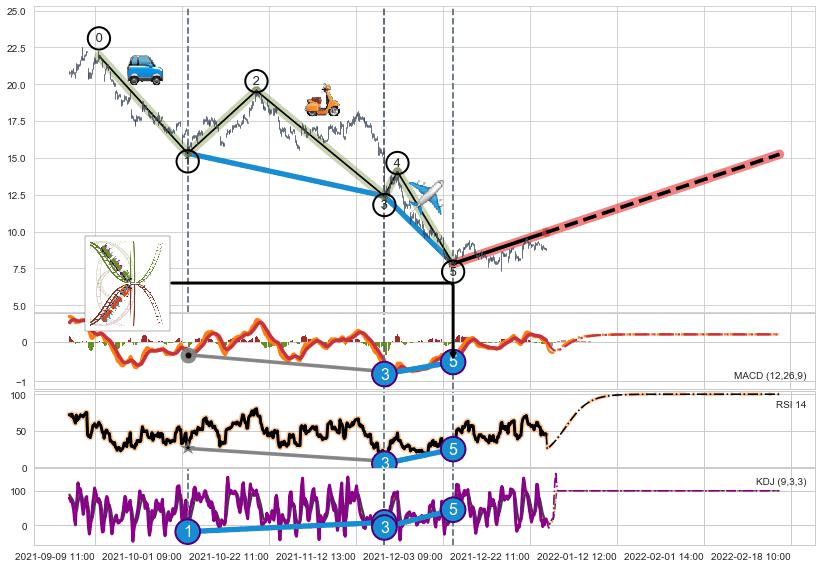 ➣ 1,3,5驱动浪MACD, RSI, KDJ走势都出现【常规背离】反转信号增强