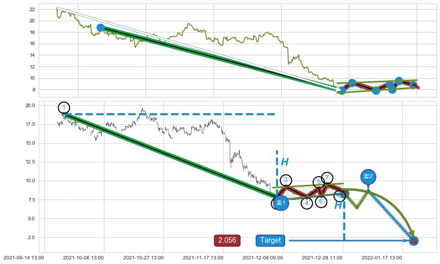 从2021-10-20 11:00至2021-12-27 15:00,共包含334个小时,阶段股价下跌-70.85%,阶段股价变动位移路程比: 1 : 6