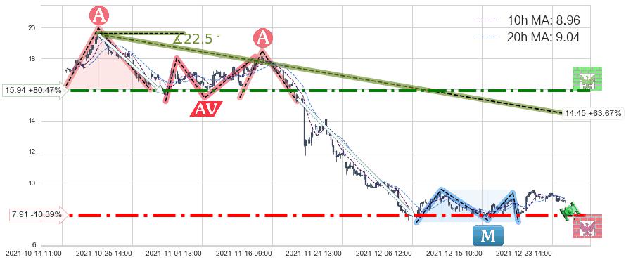 从2021-10-20 11:00至2021-12-08 09:00,共包含237个小时,阶段股价下跌-75.80%,阶段股价变动位移路程比: 1 : 4,下跌趋势角度: 22.5