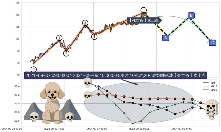 | 5 🅚:【死亡谷】卖出点 ➕ ☯️:缠论买卖点上升缠中枢AB形成后猜想拐点1卖已到达,猜想后续持续下跌(均值回复) ☞ 看空信号 ⇥ 【均线】交织【图形】⇥ 综合量化分数: 14 | > |