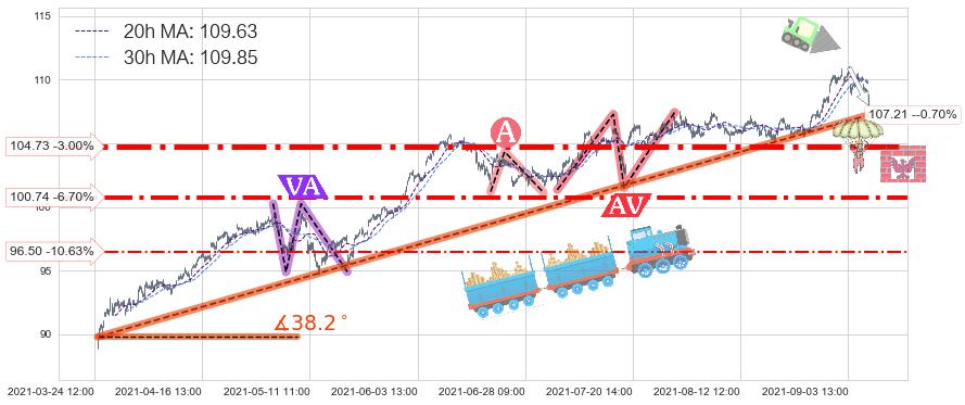 🍖 长线趋势跟踪组合短线均值回复[强支撑信号]2021-03-25 09:00-2021-09-09 13:00上升趋势依然成立(上涨趋势跟踪依然可行),短线价格略微下行回调(均值回复猜想),即将接近趋势提供的未破位的支撑价格:107.21。