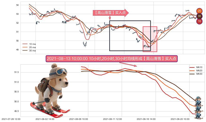 ⚀ 2021-08-05 12:00:00小时-2021-08-20 14:00:00小时显现 10小时-20小时-30小时均线 【高山滑雪】买入点 看多信号,后市看涨,买入