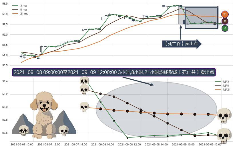 ⚀ 2021-09-08 10:00:00-小时至2021-09-09 12:00:00-小时显现 3小时-8小时-21小时均线 【死亡谷】卖出点 看空信号,后市看跌,卖出