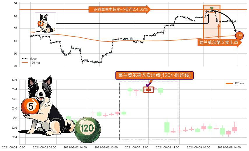 ⚀ 2021-09-07 12:00:00-小时显现 葛兰威尔均线 120小时均线 第⑤卖出点 上升趋势均值回复的短线回落信号,后市看跌,卖出信号