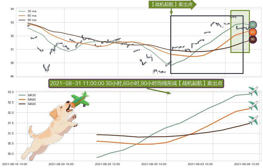 ⚀ 2021-08-23 14:00:00小时-2021-09-08 14:00:00小时显现 30小时-60小时-90小时均线 【战机起航】卖出点 看空信号,后市看跌,卖出