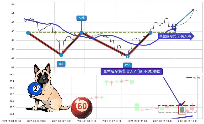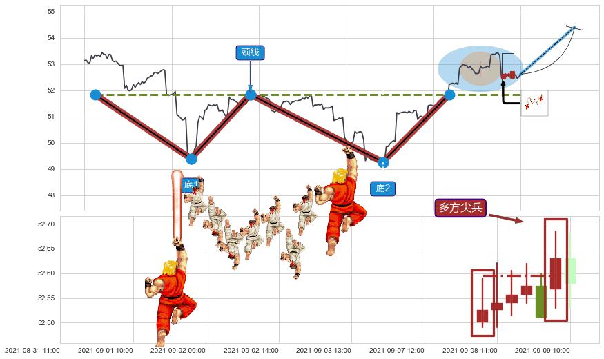 ➢ 收盘价(09-08:09: 52.50 )→回踩→第一根k线高点(09-03:14: 52.95 )