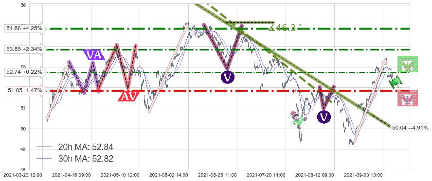 ♘ 阻力价格位53.85,可信任强度56.49%,距离最后交易2021-09-09 14:00形成的收盘价格52.62相差 +2.34%