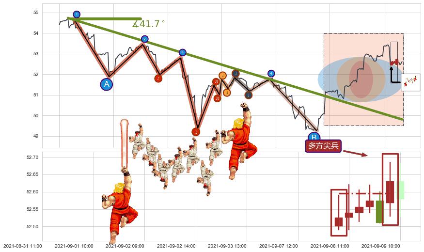 从2021-08-20 13:00至2021-09-09 14:00,共包含80个小时,阶段股价上涨6.65%,阶段股价变动位移路程比: 1 : 2