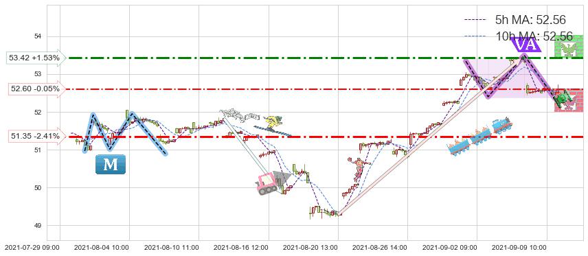 ♘ 阻力价格位53.42,可信任强度55.63%,距离最后交易2021-09-09 14:00形成的收盘价格52.62相差 +1.53%