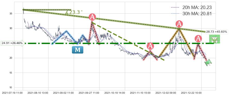 从2021-07-19 13:00至2021-12-27 15:00,共包含718个小时,阶段股价下跌-47.87%,阶段股价变动位移路程比: 1 : 17,下跌趋势角度: 23.3