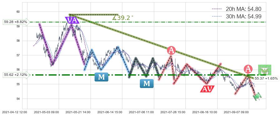 ♘ 在最后的下跌阶段2021-05-10 10:00至2021-09-09 15:00,存在 持续未破位的阻力位 ,阻力价格55.37,可信任强度83.72%,其距离最后价格54.47相差 +1.65%
