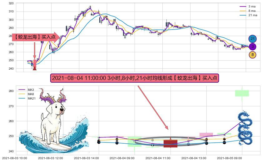 形态多维评估: ⚀ 2021-08-04 11:00:00小时显现 3小时-8小时-21小时均线 【蛟龙出海】买入点 看多信号,后市看涨,买入