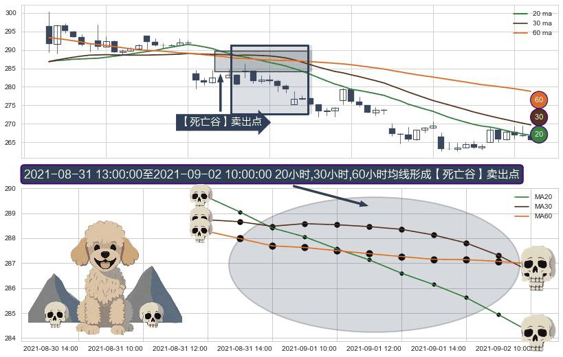 形态多维评估: ⚀ 2021-08-31 14:00:00-小时至2021-09-02 10:00:00-小时显现 20小时-30小时-60小时均线 【死亡谷】卖出点 看空信号,后市看跌,卖出