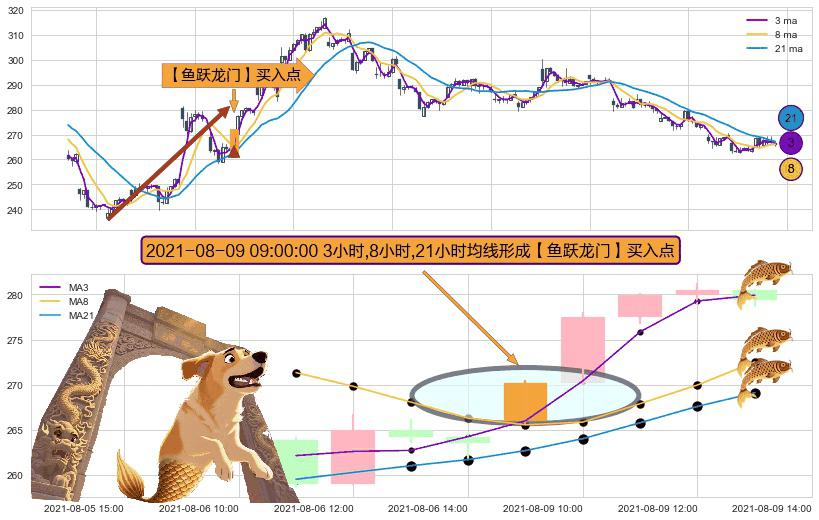 形态多维评估: ⚀ 2021-08-09 09:00:00小时显现 3小时-8小时-21小时均线 【鱼跃龙门】买入点 看多信号,后市看涨,买入