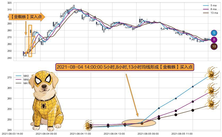 形态多维评估: ⚀ 2021-08-04 14:00:00小时显现 5小时-8小时-13小时均线 【金蜘蛛】买入点 看多信号,后市看涨,买入