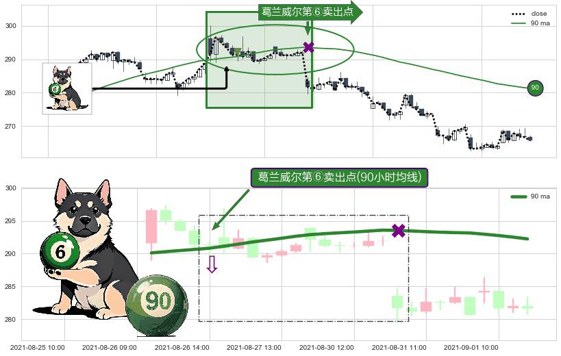 形态多维评估: ⚀ 2021-08-26 14:00:00-小时显现 葛兰威尔均线 90小时均线 第⑥卖出点 走势反转见顶信号,后市看跌,卖出信号