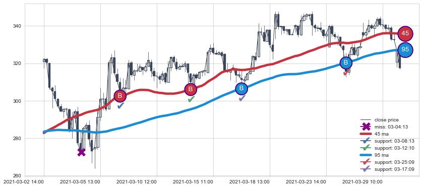 上涨趋势03-02 14:00-03-30 10:00,均线45, 95确认关键支撑4处
