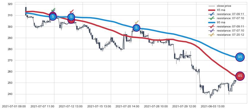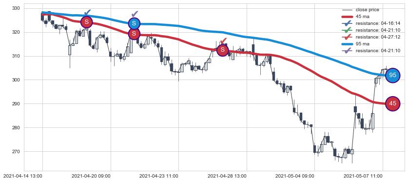 下跌趋势04-14 13:00-05-07 12:00,均线45, 95确认关键阻力3处