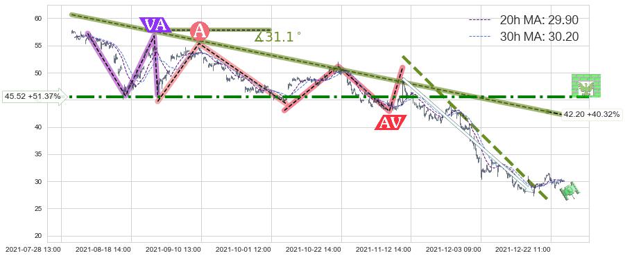 ♘ 在最后的下跌阶段2021-08-02 09:00至2021-12-21 13:00,存在 持续未破位的阻力位 ,阻力价格42.20,可信任强度87.18%,其距离最后价格30.07相差 +40.32%
