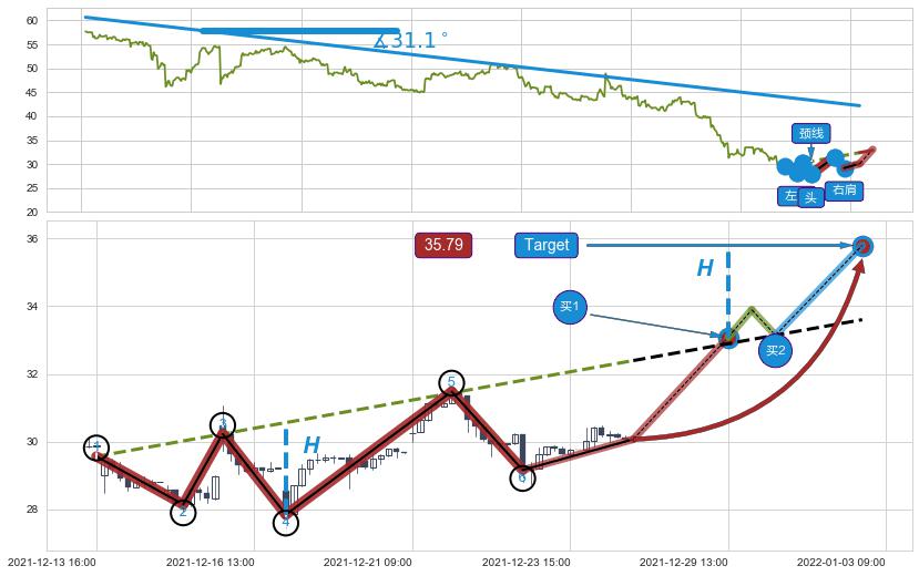 从2021-08-02 09:00至2021-12-21 13:00,共包含681个小时,阶段股价下跌-54.80%,阶段股价变动位移路程比: 1 : 9,下跌趋势角度: 31.1,2021-08-27 09:00向↘︎形成缺口,跳空下跌-14.34%˚