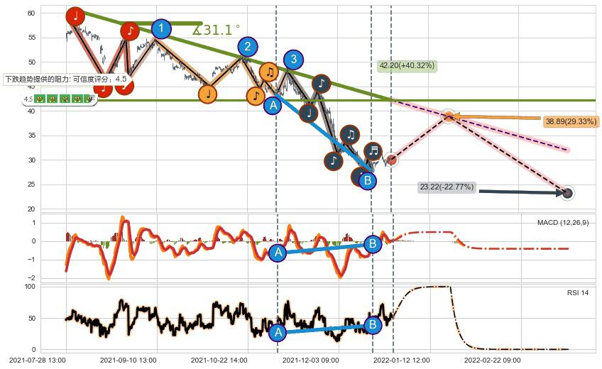 ➢ 预测:2022-01-20 15:00,【小幅反弹】稳定目前下跌趋势的前提下,预测价格:38.89