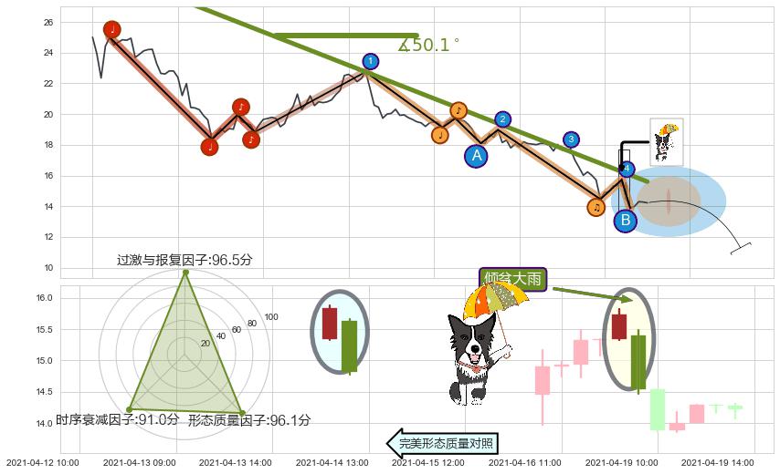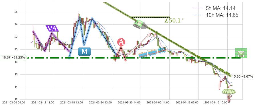 从2021-04-01 10:00至2021-04-19 14:00,共包含71个小时,阶段股价下跌-44.27%,阶段股价变动位移路程比: 1 : 2,下跌趋势角度: 38.0