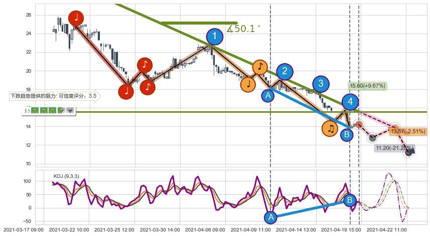 ➣ 预测:2021-04-21 14:00,【试探阻力】稳定目前下跌趋势的前提下,预测价格:13.87
