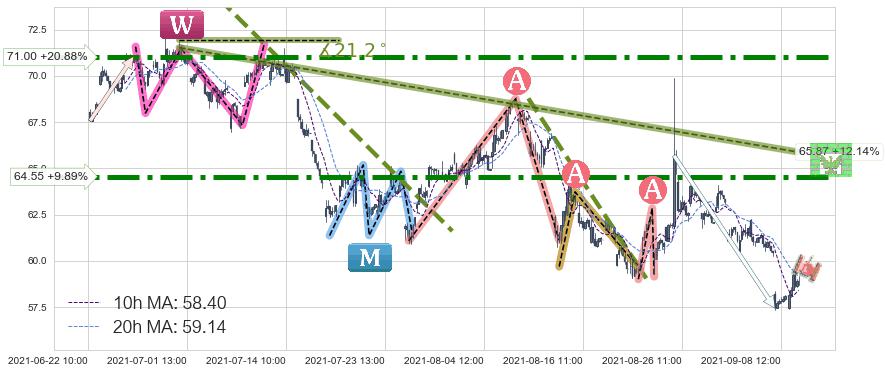 ♘ 阻力价格位71.00,可信任强度96.95%,距离最后交易2021-09-09 14:00形成的收盘价格58.74相差 +20.88%