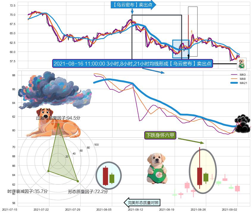从2021-08-06 14:00至2021-08-23 11:00,共包含67个小时,阶段股价下跌-9.80%,阶段股价变动位移路程比: 1 : 4,下跌趋势角度: 61.6,2021-08-12 09:00向↘︎形成缺口,跳空下跌-7.82%˚