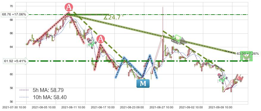 ♘ 阻力价格位61.92,可信任强度71.86%,距离最后交易2021-09-09 14:00形成的收盘价格58.74相差 +5.41%