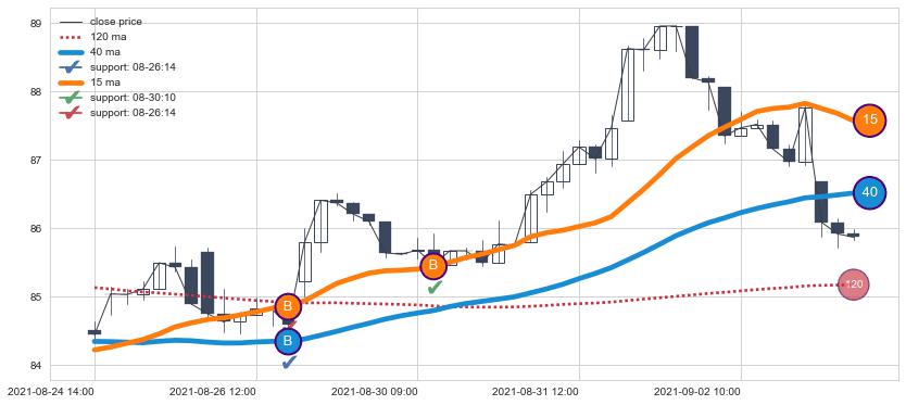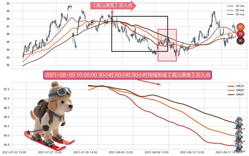 ⚀ 2021-07-30 09:00:00小时-2021-08-17 12:00:00小时显现 30小时-60小时-90小时均线 【高山滑雪】买入点 看多信号,后市看涨,买入