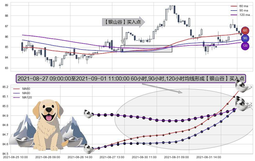 ⚀ 2021-08-27 10:00:00-小时至2021-09-01 11:00:00-小时显现 60小时-90小时-120小时均线 【银山谷】买入点 看多信号,后市看涨,买入
