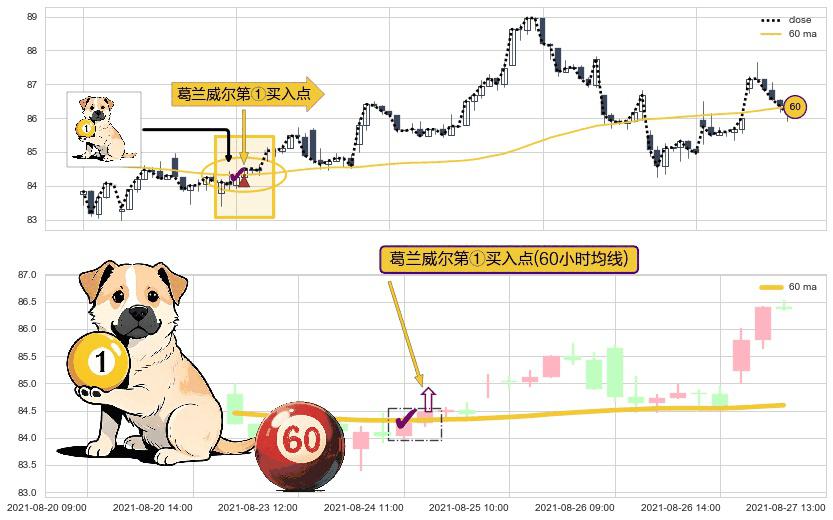⚀ 2021-08-24 12:00:00-小时显现 葛兰威尔均线 60小时均线 第买①入点 走势反转见底信号,后市看涨,买进信号