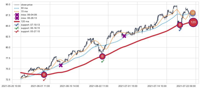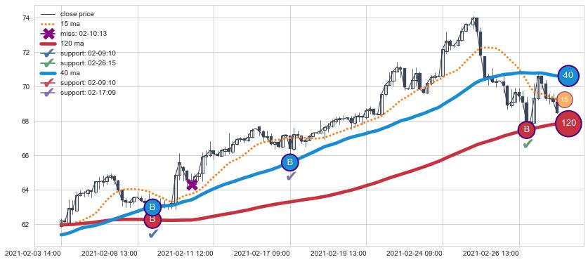⚅ 买点向上突破均线后,价格走势很纠结,不断在均线周围试探,有再次下探破位均线的可能