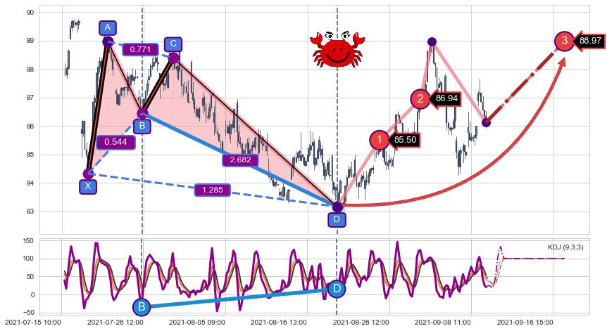 ➣ 已完成【螃蟹】形态起点X: 07-19:13, 终点D: 08-19:12, 共153交易小时
