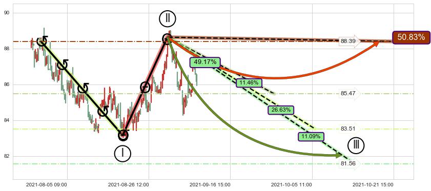 ➣ 循环浪继续向下【平均值】位置(10-05:15, 83.51),匹配聚类样本比例54.15%, 可能性概率26.63%