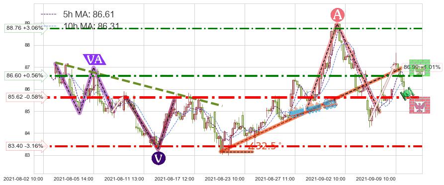 ➢ 2021-08-19 12:00-2021-09-01 14:00上升趋势存在反转[风险],其原上升趋势的支撑位(86.99)已破位[强阻力信号],原上升趋势角度: 32.5˚