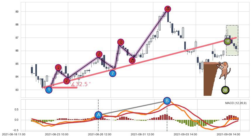 ✂️ 2021-08-19 12:00-2021-09-01 14:00上升趋势存在反转[风险],其原上升趋势的支撑位(86.99)已破位[强阻力信号],原上升趋势角度: 32.5˚