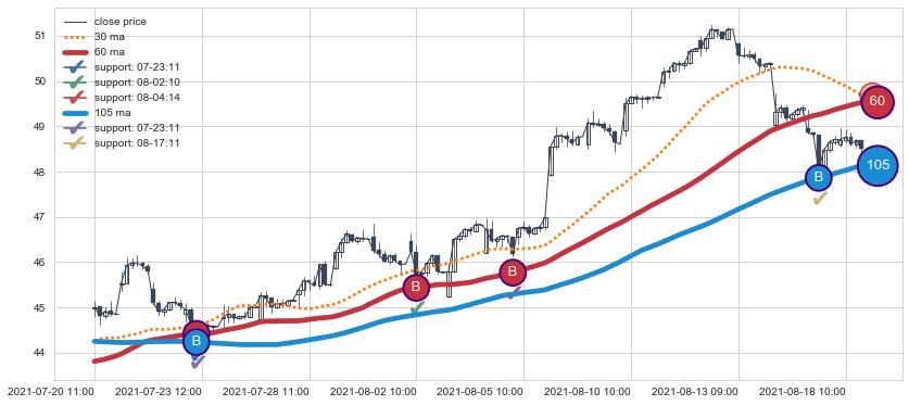 上涨趋势07-20 11:00-08-18 13:00,均线105, 60确认关键支撑4处