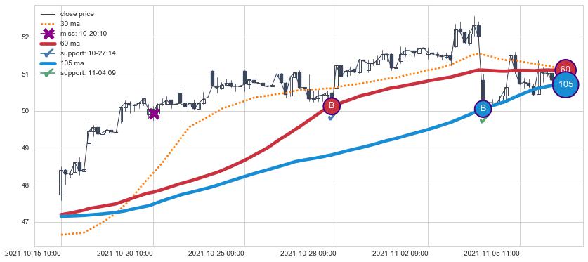 上涨趋势10-15 10:00-11-08 13:00,均线105, 60确认关键支撑2处