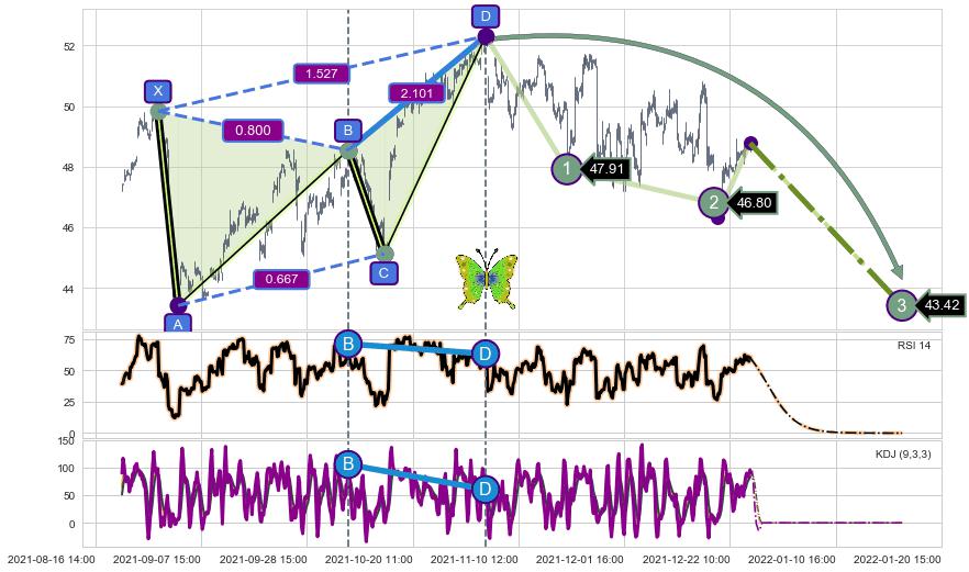 ➣ 未完成【蝴蝶】形态起点X: 09-20:13, 已到达C点: 12-16:13, 预测最终D点: 04-05:15, 共998交易小时