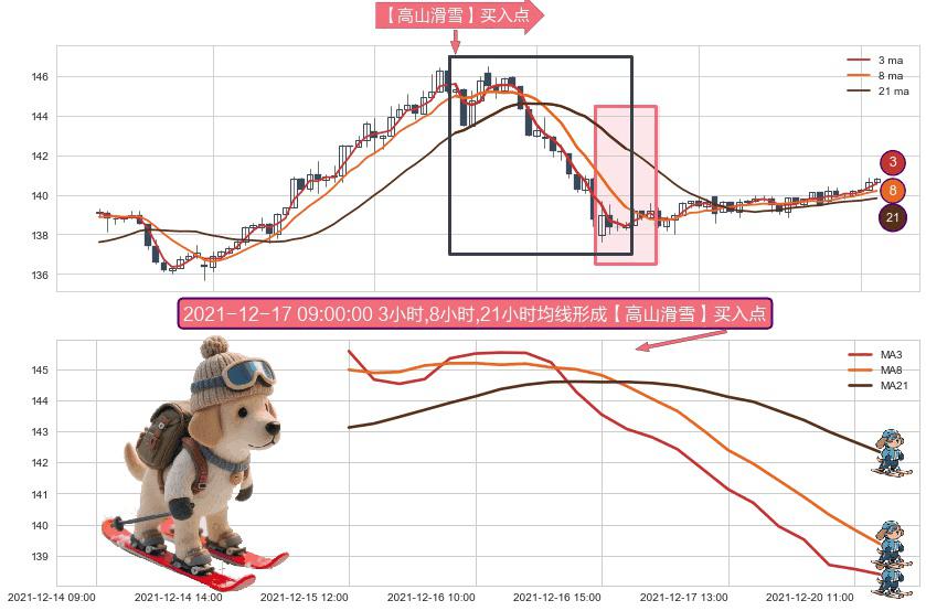 形态多维评估: ⚀ 2021-12-15 12:00:00小时-2021-12-20 12:00:00小时显现 3小时-8小时-21小时均线 【高山滑雪】买入点 看多信号,后市看涨,买入
