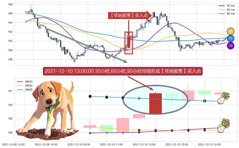 形态多维评估: ⚀ 2021-12-10 13:00:00小时显现 30小时-60小时-90小时均线 【旱地拔葱】买入点 看多信号,后市看涨,买入