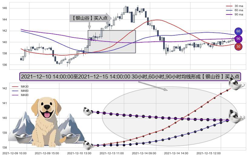 形态多维评估: ⚀ 2021-12-10 15:00:00-小时至2021-12-15 14:00:00-小时显现 30小时-60小时-90小时均线 【银山谷】买入点 看多信号,后市看涨,买入