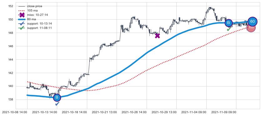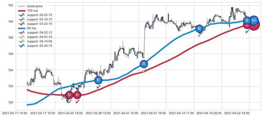 上涨趋势03-11 14:00-04-22 14:00,均线105, 60确认关键支撑6处