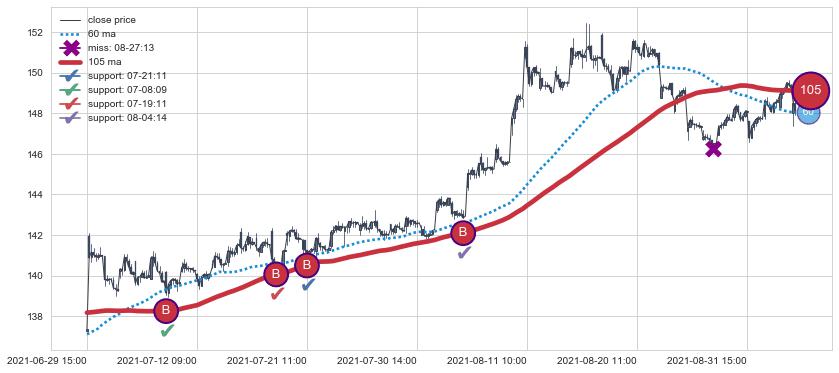 上涨趋势06-29 15:00-09-07 10:00,均线105确认关键支撑4处