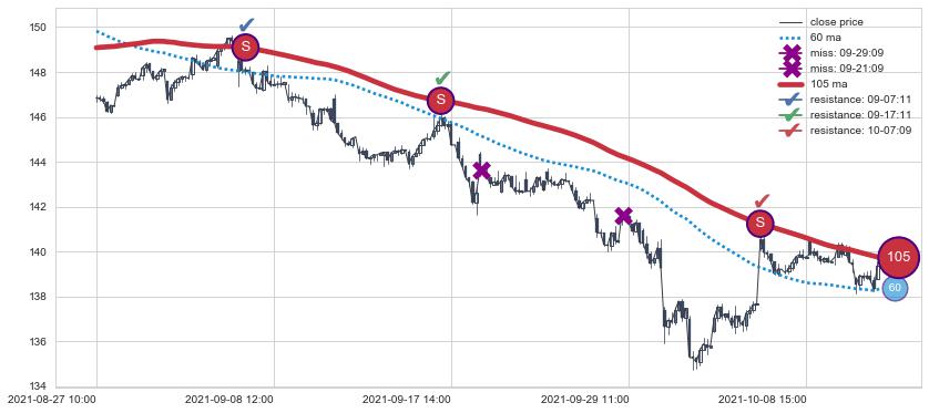 下跌趋势08-27 10:00-10-14 10:00,均线105确认关键阻力3处