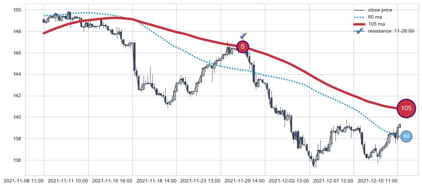 下跌趋势11-08 11:00-12-10 12:00,均线105确认关键阻力1处