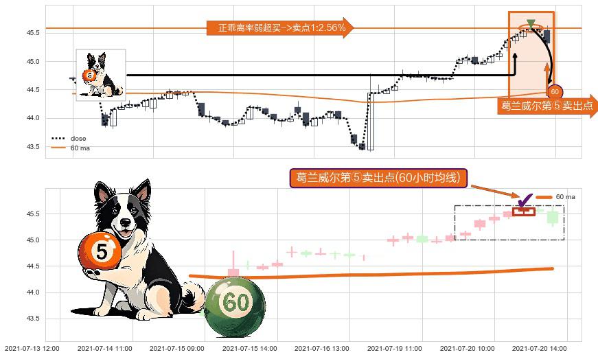形态多维评估: ⚀ 2021-07-20 12:00:00-小时显现 葛兰威尔均线 60小时均线 第⑤卖出点 上升趋势均值回复的短线回落信号,后市看跌,卖出信号